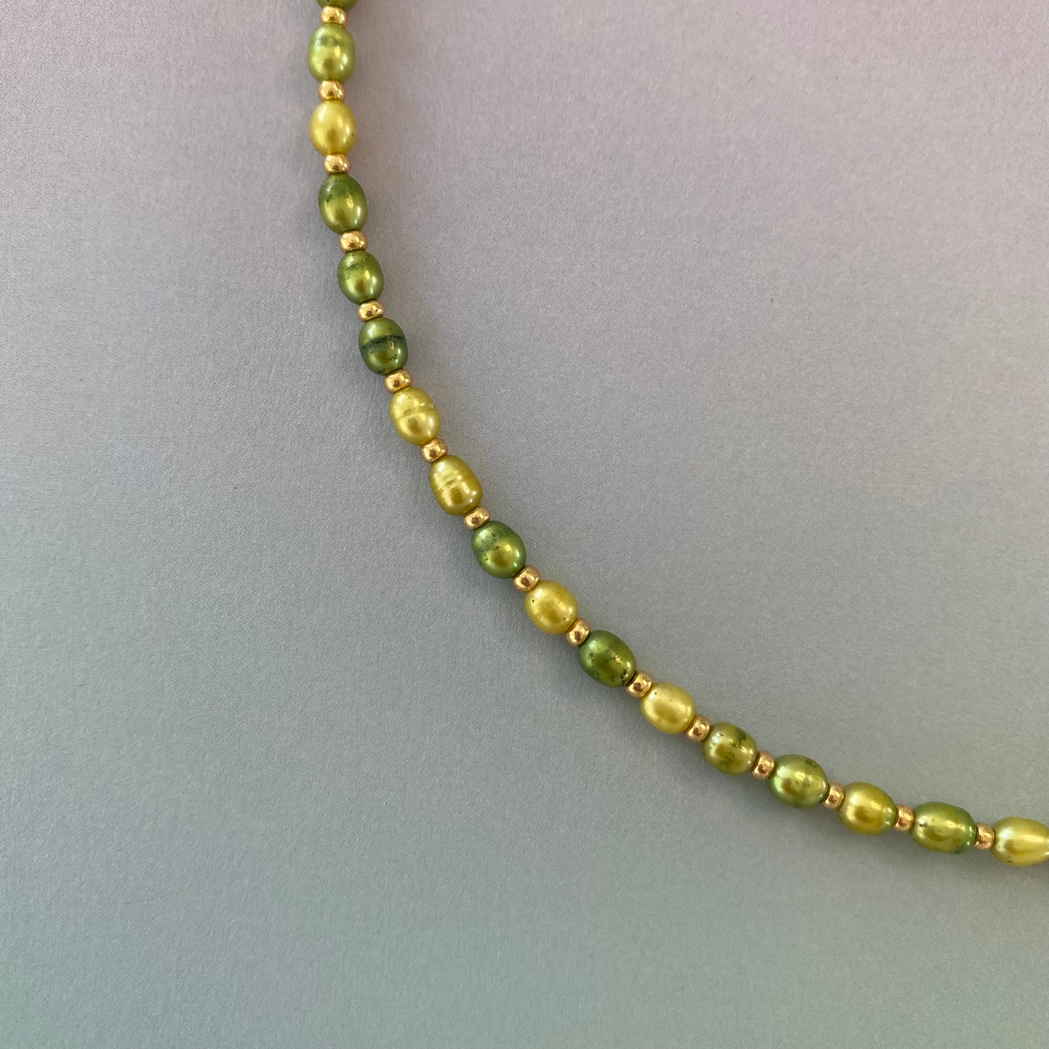 Green colour rice pearls with gold glass beads. Gold plated lobster clasp closure.